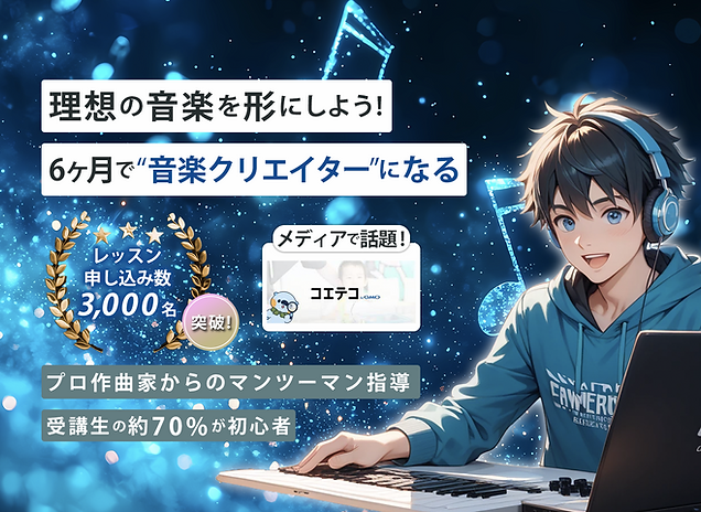 現役の音楽プロからの直接指導で、楽曲制作・SNS配信・案件獲得まで一気通貫で学べる、日本最高峰のDTM総合スクール。